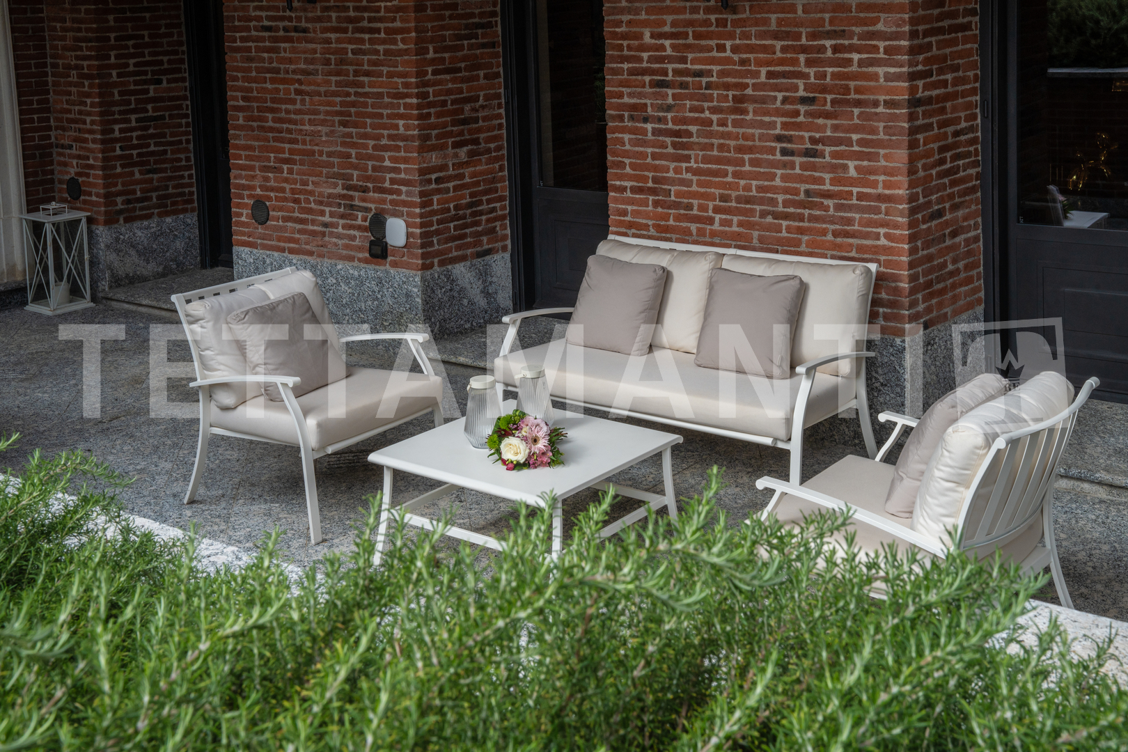 The heart of the residence is the approximately 180 square meter living area, a visually striking space characterized by classic stone columns, terracotta floors, and views of the greenery. The space is divided into three evocative areas: